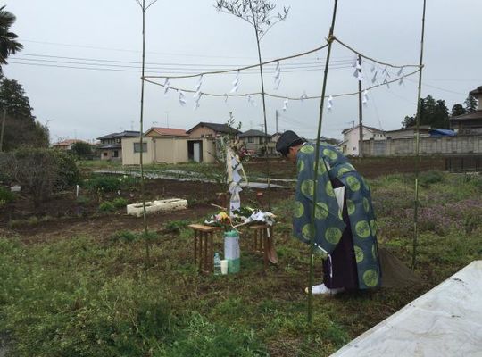 2016/04/12「辺田の平屋」の地鎮祭を執り行いました。 直前まで雨が降っていたのですが、 始まる頃には雨もあがり、滞りなく行えました。 平屋の開放的な家になります。 -